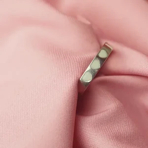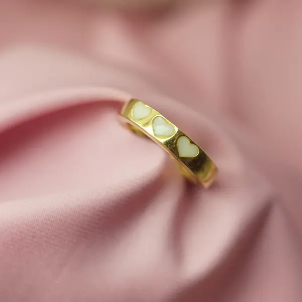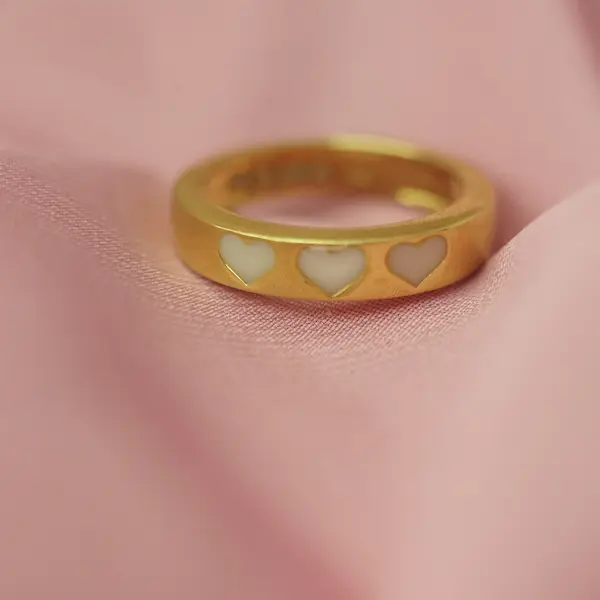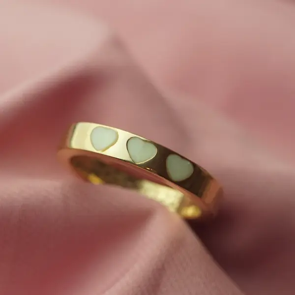Esta alianza lleva una banda central de plata que recorre el anillo al completo y tres corazones donde se alojará el recuerdo de tu lactancia.