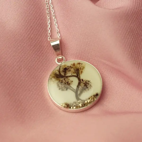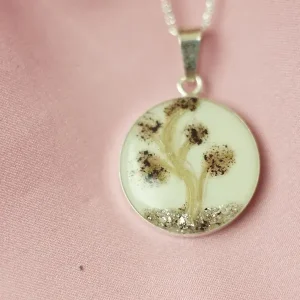 El colgante Cabú Baúm está hecho con lecha materna, pelito y cordón umbilical (si no se dispone de cordón umbilical puede hacerse con brillo de plata).