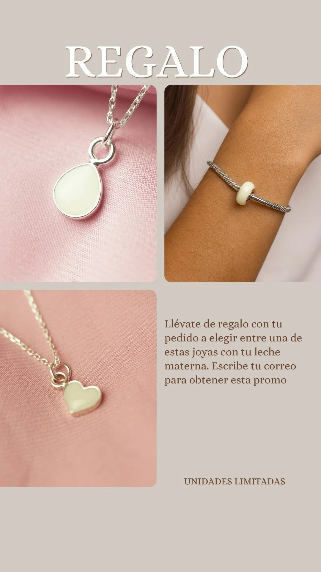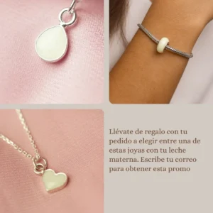 Todas las piezas están hechas en Plata de Ley y se elaborarán con tu leche materna (y si lo deseas, también con pelito o cordón umbilical).